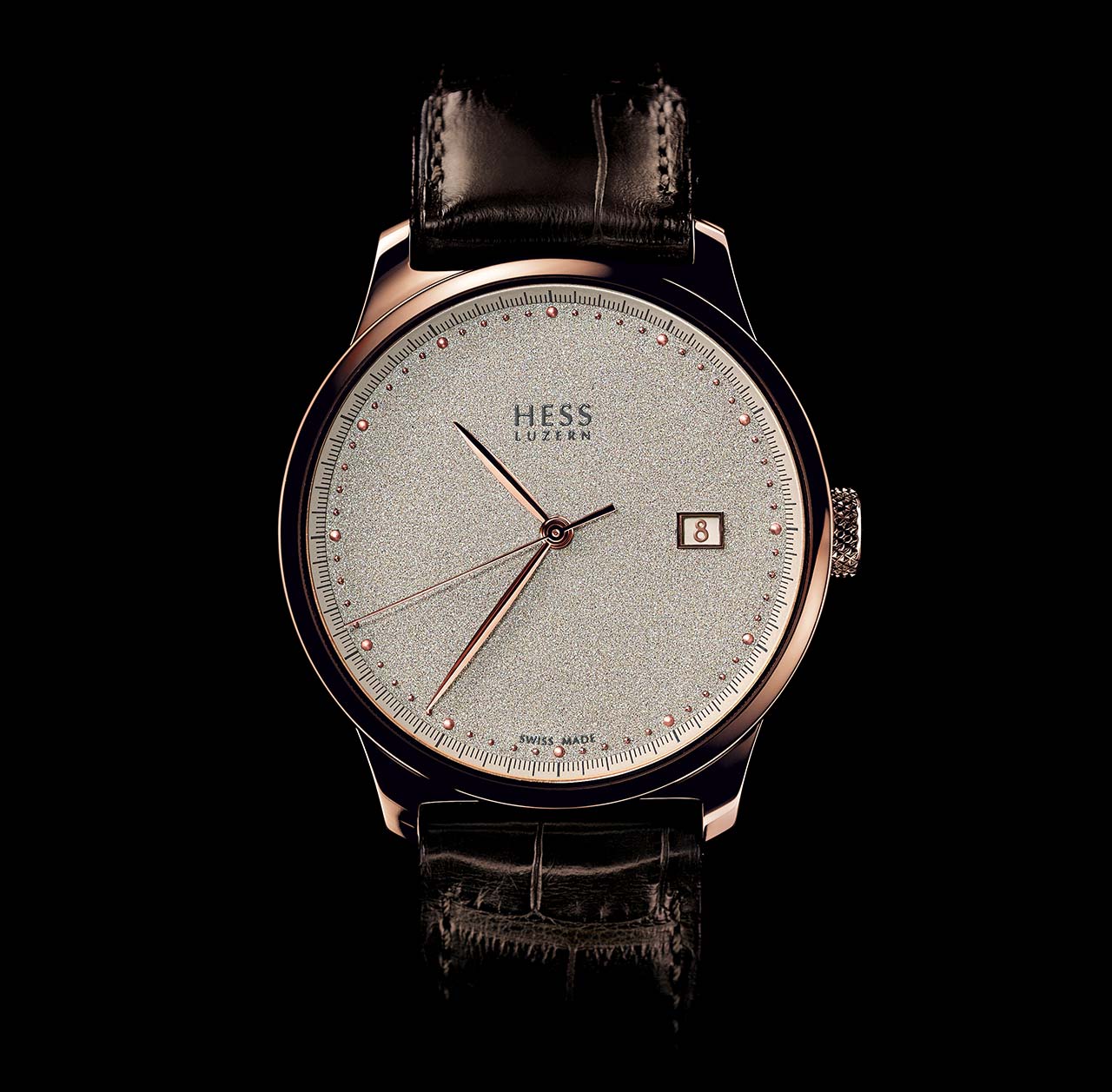 - Die Uhr ist mit einem farblich passenden Krokolederband (Braloba, Lengnau, mit CITES Zertifikat) oder Rindslederband (Eisenbahn, Luzern) mit einer Stiftschliesse im Gehäusematerial ausgestattet.